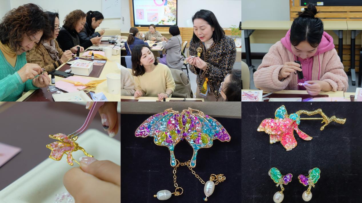 来自工作室的老师们认真讲解了中国传统工艺螺钿的历史知识和种类用途,并指导老师们现场制作了精美的螺钿胸针和耳饰。大家兴趣盎然、跃跃欲试,在专业老师的指导下纷纷制作出了自己独一无二的作品,收获了满满的成就感。亲手制作的胸针和耳饰既是送给自己也是送给家人最好的礼物。