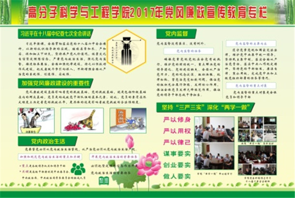 4月7日党委中心组以十八届六中全会精神、“两会”会议精神、习近平同志在全国高校思想政治工作会上的讲话精神、教育系统党风廉政建设工作视频会议精神和公司2017年党风廉政建设工作会议精神为主要内容,并就《关于新形势下党内政治生活的若干准则》进行了专题学习。4月15日在江安校区举办了第十一届“高工铸梦,材蕴匠心”PSE活动月开幕式暨师生趣味运动会
