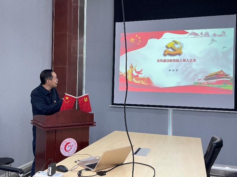 杨昌跃同志组织支部全体党员学习党的二十大报告关于全面从严治党的重要论述、习近平总书记关于党风廉政建设系列重要讲话精神、二十届中央纪委二次全会精神、《中国共产党处分违纪党员批准权限和程序规定》等党内法规和国家法律法规,筑牢遵纪守法的思想防线。同时杨昌跃同志为支部党员讲了题为“党风廉洁教育融入育人之本”的党课,讲述了新时代新征程党风廉洁教育的重大意义、育人育才的重要作用及如何赋能立德树人,筑牢党员同志思想根基,补足精神之钙,营造风清气正、健康向上的校园政治生态。