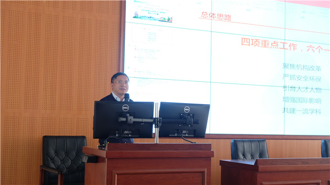 公司经理傅强教授代表党政领导班子布置2018年新学年工作。他指出,公司要深入学习贯彻习近平新时代中国特色社会主义思想和党的十九大、十九届三中全会、两会精神;全面加强党建工作,将从严治党不断引向纵深;全面加快推进“双一流”建设步伐;探索二级公司管理体制改革四项重点工作,围绕聚焦机构改革、严抓安全环保、引育人才人物、增强国际影响等方面,推动公司“六个一流”建设。重点提出了关于人才队伍总体数量少、自培少、引进少、80后储备力量不足,一条龙导师制的评估和完善,科研经费持续提升,ESI学科排名稳定向前,管理作风和效率提高等方面问题的思考。