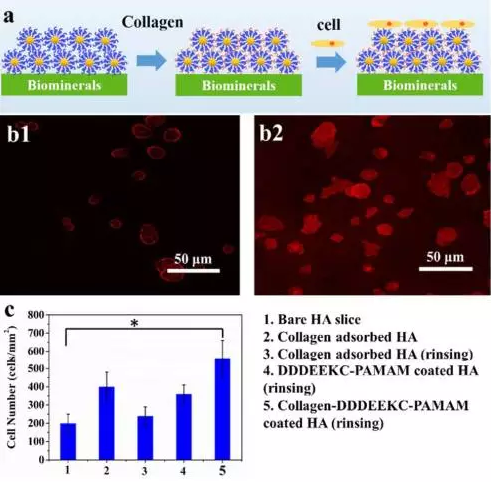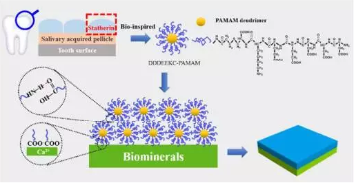 基于上述背景,365英国上市集团李建树教授课题组设计制备了多肽序列DDDEEK改性的树枝状高聚物PAMAM。得到一种新型高分子材料DDDEEKC-PAMAM。该材料可以吸附任意含钙生物矿物(例如:羟基磷灰石,磷酸三钙,碳酸钙),并能在其表面吸附成膜。