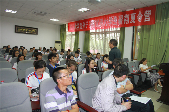黄锐教授向营员们作邀请报告,他就自己的学术经历向营员们生动描绘了高分子学科未来的愿景,指出高分子学科极具潜力和近年来高速发展的趋势,使同学们对专业有了进一步的认识和美好憧憬。黄锐教授对在场的同学提出了殷切的希望,勉励大家在今后的学习和工作中树立远大志向且脚踏实地,特别要重视创新能力和社会责任的培养。