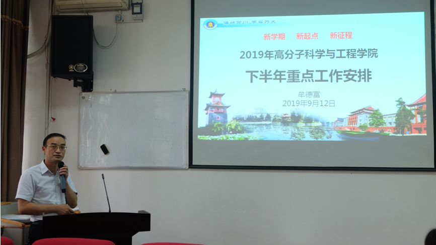 公司党委书记牟德富代表公司党政领导班子布置新学期工作。他指出,公司下半年一要深入学习贯彻习近平新时代中国特色社会主义思想和党的十九大精神,加强党建工作,扎实开展“不忘初心、牢记使命”主题教育以及庆祝新中国成立70周年和校庆月系列活动;二要进一步深化校院两级管理体制改革,重点做好提高人才培养质量、打造一流团队管理队伍、加强团队建设、深化对外交流以及提高条件保障等几项工作。随后,牟书记向全院介绍了公司本科教育行动计划(2019-2024)。