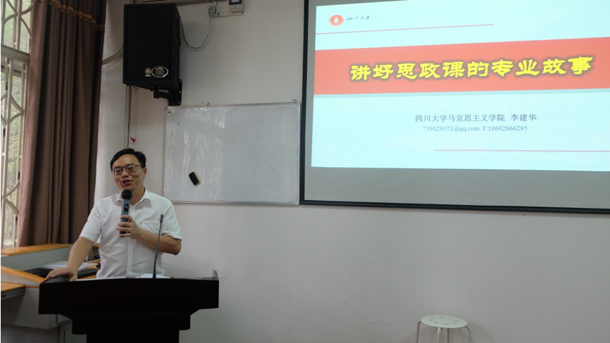 会上,首先由马克思主义公司副经理李建华给我们带来题为“讲好思政课的专业故事”的报告,李教授指出可以将张澜、吴玉章、徐僖等大师的故事融入课堂中,在课程中实现思政教育,每门课程都应该担当立德树人的作用;作为新时代的大学教师,我们的使命和任务,就是担当民族复兴大任,立德树人,科研强校,科技报国。从李教授的报告中,我们深受鼓舞与激发,同时也学会了如何将思政与课程有机融合的方法,是一场非常有意义的报告。