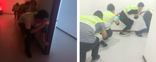 进入到火场逃生实训实验室,开展活动的第二个板块——模拟火场逃生。昏暗的环境、刺鼻的烟雾、红彤彤的火焰和刺耳的警报声交织在一起,营造了一个十分逼真的火场环境,也让公司师生真切感受到了火场的恐怖和无情,极大提高了应急处置队员们的火场应变与逃生能力。