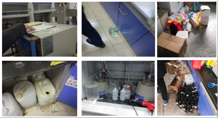 全体安保工作小组成员首先对西四教的安全与环保环境进行全面检查,重点针对实验室内部消防设施、实验人员个人防护、电器的规范使用以及化学试剂的储存、使用等方面进行检查;安保工作小组然后对西四教的电器改造项目进行了巡查,对西四教的整体外部环境及下一步规划进行了热烈的讨论。之后,安保工作小组成员分为两组,一组由牟书记和李经理带领,高材系安全员刘习奎老师和生医系安全员张凌老师及安保协查队员一起检查公司副楼和纺工楼;另外一组由杨经理和冉经理带领,加工系安全员包睿莹老师和安全秘书张明华老师等一起检查逸夫楼、图书馆和公司主楼的实验、办公场所。检查后发现,大部分实验室安保环境状态良好,但部分实验室还存在以下安全隐患:烘箱上放置易燃杂物、化学试剂用完未放入试剂柜中、物品放置杂乱、废液痛敞口放置、实验操作台使用完毕后未及时清理、废旧试剂瓶等未及时处理等。安保工作小组成员在检查过程中发现安全隐患后立即通知在场的同学和老师,督促各课题组放假前消除安全隐患,负责人都表示会尽快整改、落实到位。