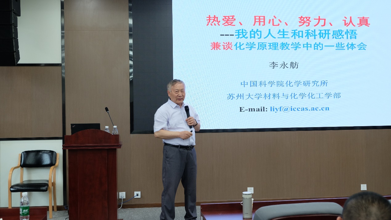 李永舫院士从他的人生轨迹出发,分享了对人生及科研的感悟和从其个人经历中总结出“热爱、用心、努力、认真”的八字箴言。李院士从“人生感悟:人生苦乐相伴”、“努力:天道酬勤”、“认真:为人“待人以诚”、做事“一丝不苟”等几个方面,分享了自己这些年在生活、教学、科研等方面的经验,李院士强调机会总是青睐有准备的人,有实力才会有机会,而实力需要我们平时的努力来铸就。最后,李院士分享了他为中国科公司大学本科生讲授《化学原理》课程过程中的体会,在授课过程中向同学灌输“热爱、用心、努力、认真”的八字箴言和人生信念,并将最新研究成果和最新工业生产现状融入教学中,引导他们真正地热爱化学。
