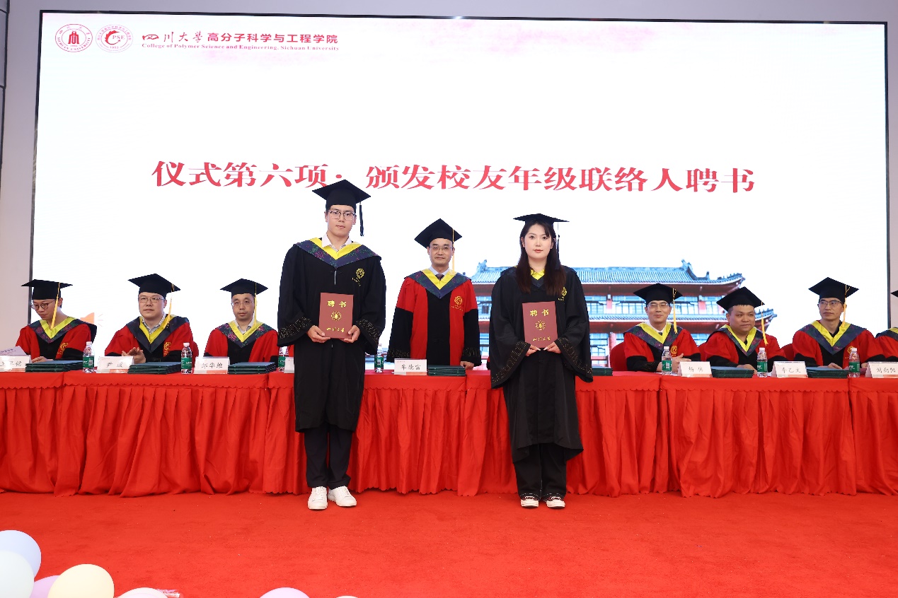 毕业典礼上,牟德富教授向单朗、蒋佳嵘颁发2025届员工年级联络人聘书。