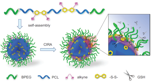 自组装聚合物胶束作为多功能药物递送系统的应用已受到广泛关注,已有种类繁多的聚合物胶束给药系统进入临床实验或被FDA批准使用。然而,它们的治疗效果并没有达到预期,主要原因之一在于大多数聚合物胶束不能承受高倍稀释及与血液成分的相互作用,导致药物的提前暴释和非特异性体内分布。物理或化学交联是改善自组装体稳定性的最直接方法,但其同时也降低了纳米系统的响应性和释放速率。因此,聚合物自组装体的稳定和响应仍是纳米载体领域存在的矛盾难题。