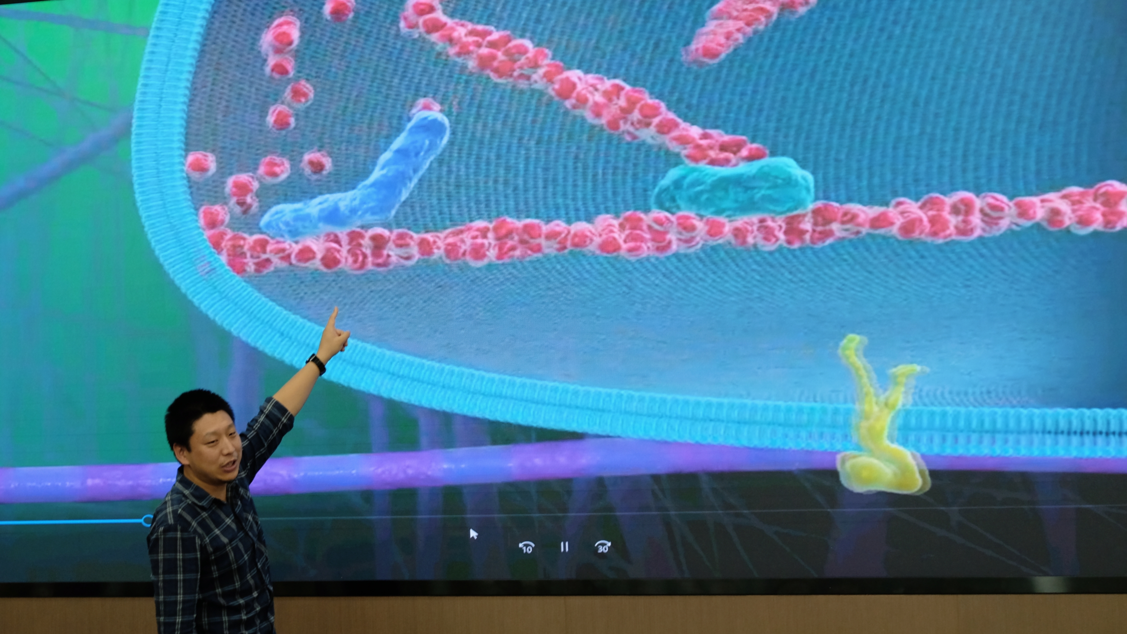 公司魏强研究员首先向同学们解释了什么是高分子,结合生动的视频资料向同学们详细阐述了细胞与微环境相互作用的基础科学问题。魏老师让同学们上台来模拟肌球蛋白、组蛋白和骨架,直观有趣地展示了细胞内细胞骨架的聚合过程,激起了同学们对细胞力学和交叉学科研究的兴趣,拓宽了科学视野。