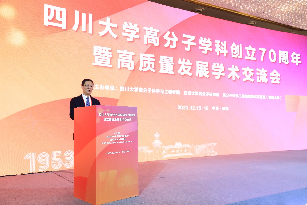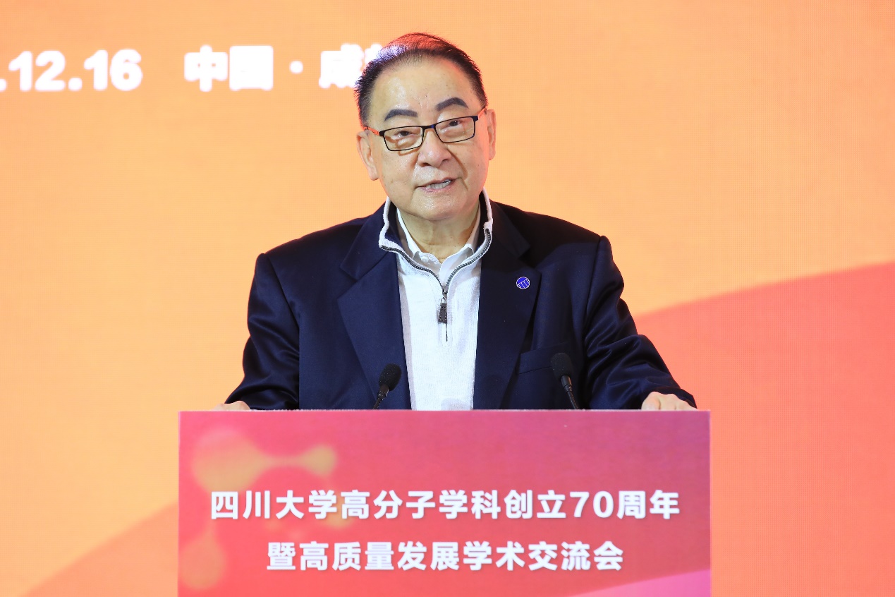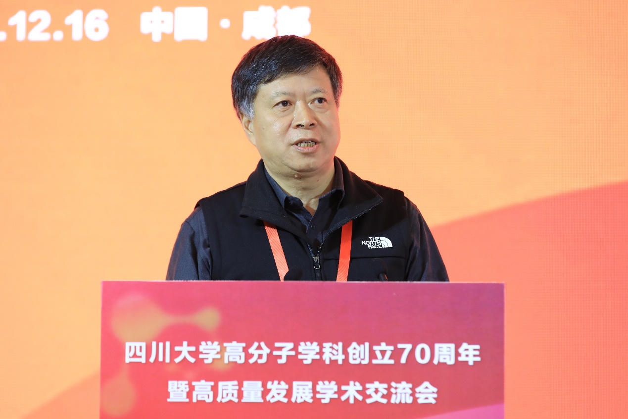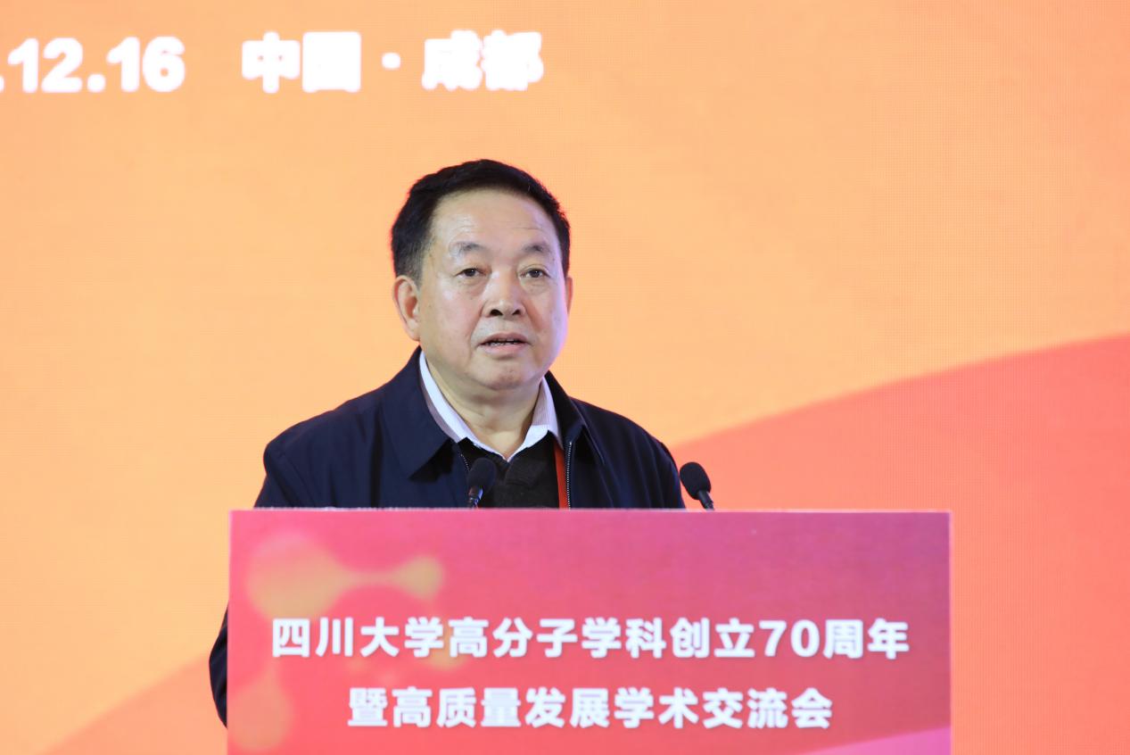 程正迪院士作嘉宾代表致辞。他分享了与川大高分子的深厚友谊。他表示,川大高分子对中国高分子学科的发展起到了重要作用,70年来,培养了诸多国家栋梁、创造出诸多具有科技特色的科研成果,为国家富强作出重要贡献,也为中国高等教育与科学的发展写下浓墨重彩的一笔。他祝愿,在新的70年里,川大高分子为国家、为人民、为科技、为人类福祉作出新的贡献。