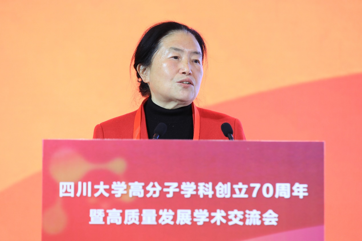 王琪院士代表学科教师发言。她深情回顾了在川大高分子的学习工作经历。她讲到,作为员工她永远铭记老师们的教育培养,作为老师,她时刻牢记“为党育人 为国育才”的使命,作为团队建设者,她致敬历代师生为学科发展作出的努力和贡献。她分享了学科在团队队伍建设、人才培养、研究平台等多方面取得的突出成就,并寄语师生不负时代使命,传承学科荣光,为国家富强、民族复兴作出更大贡献。