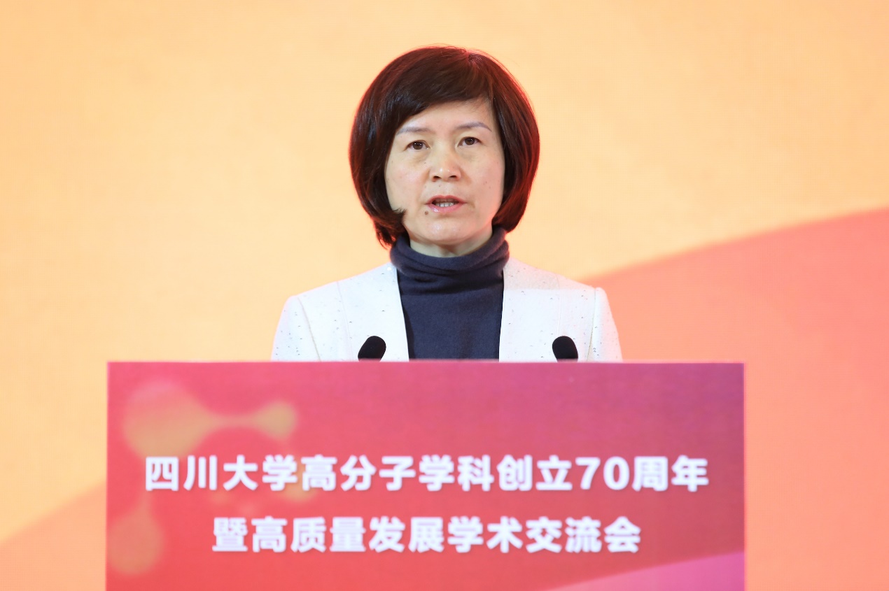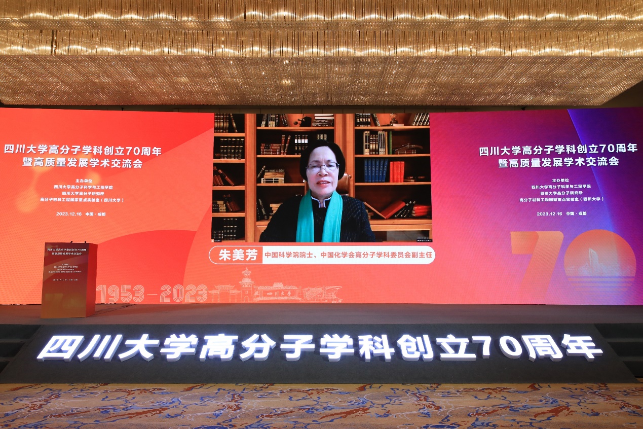 朱美芳院士代表中国化学会高分子学科委员会发表视频致辞。她表示,川大高分子是中国高分子材料发展史的见证者更是推动者。学科在徐僖院士等老一辈创始人的引领下、历代师生的接续奋斗下,书写了“川军”的辉煌篇章,成为高分子材料科技和教育领域的中坚力量及国际学术交流的重要中心。她期待,新征程上川大高分子能以70周年为契机,在继往开来中向世界一流迈进。