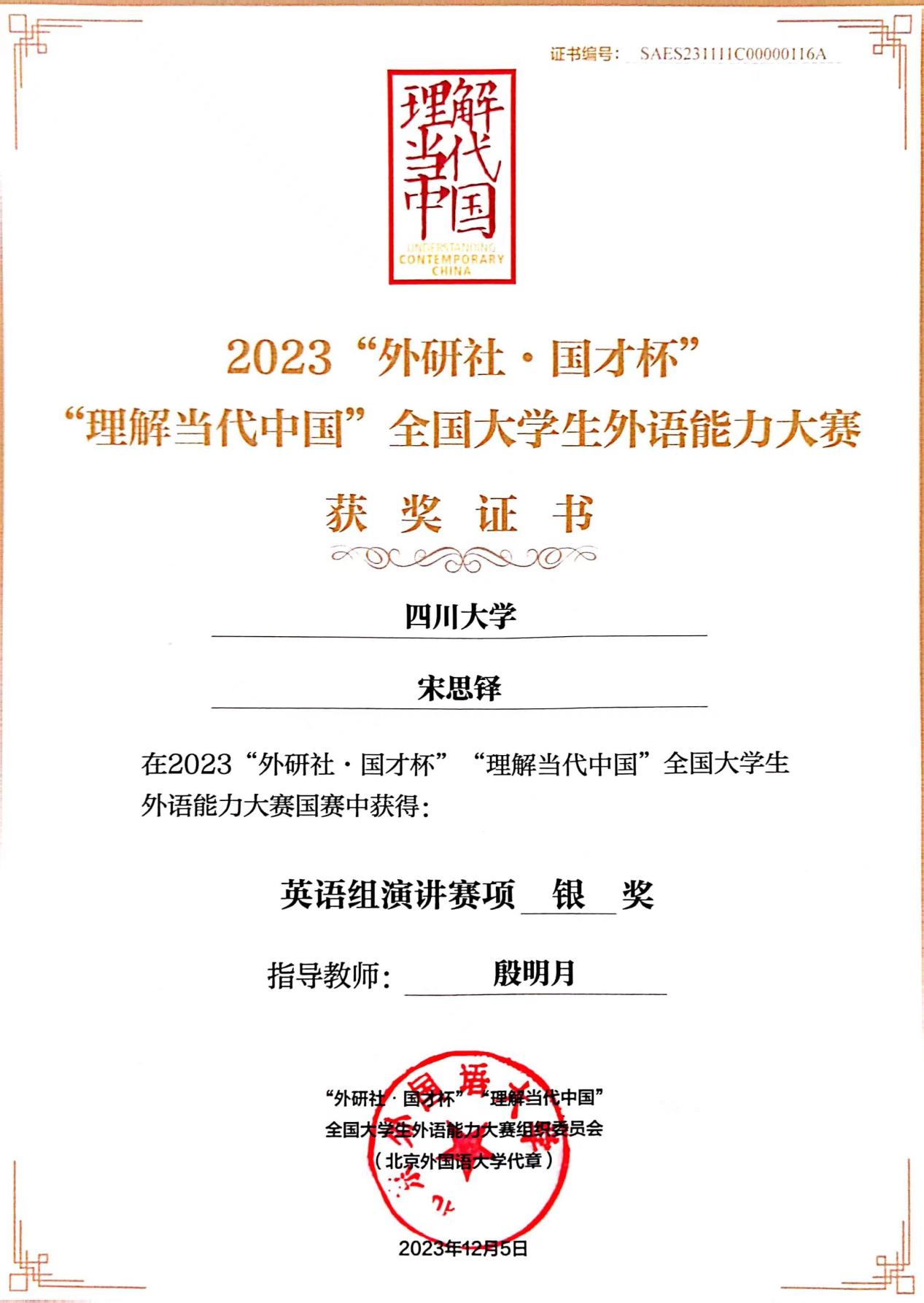 在365英国上市集团校赛中,宋思铎作为唯一入围校赛的工科员工,在外国语公司殷明月老师指导下,历经五轮比赛,耗时整整两个月,凭借出色的表现先后获得校赛特等奖(第一名)、四川省省赛金奖(第三名),最终在全国决赛中荣获银奖。