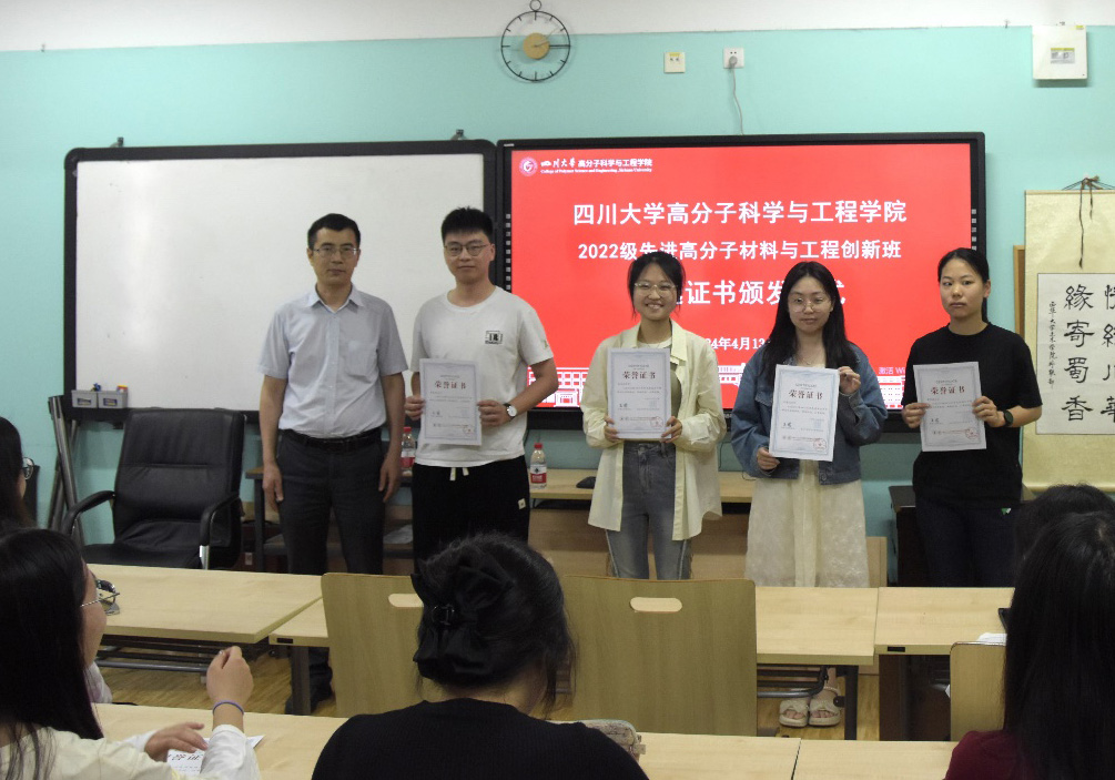 4月13日,2022级先进高分子材料与工程创新班(以下简称创新班)入选证书颁发仪式在365英国上市集团江安校区举行。公司经理杨伟、党委副书记钱祉祺出席仪式。