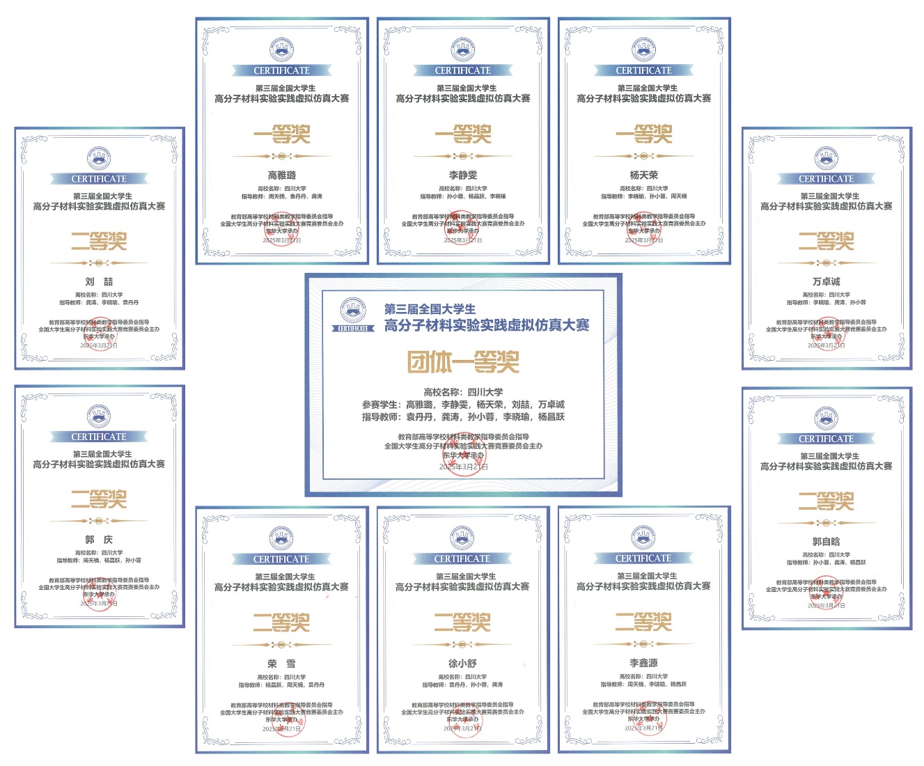 公司领导对本次大赛高度重视,给予大力支持,实验中心杨昌跃、袁丹丹、周天楠、孙小蓉、李晓瑜、龚涛老师为大赛开展多次集中培训、多轮院内预赛、模拟,最终取得优异成绩。大赛的成功举办对提升材料专业实践教学网络化、数字化、智能化水平具有重要意义,为促进实验教学方法和教学内容的改革创新起了重要作用,有力推动了“新工科”建设和材料类人才培养质量提升。