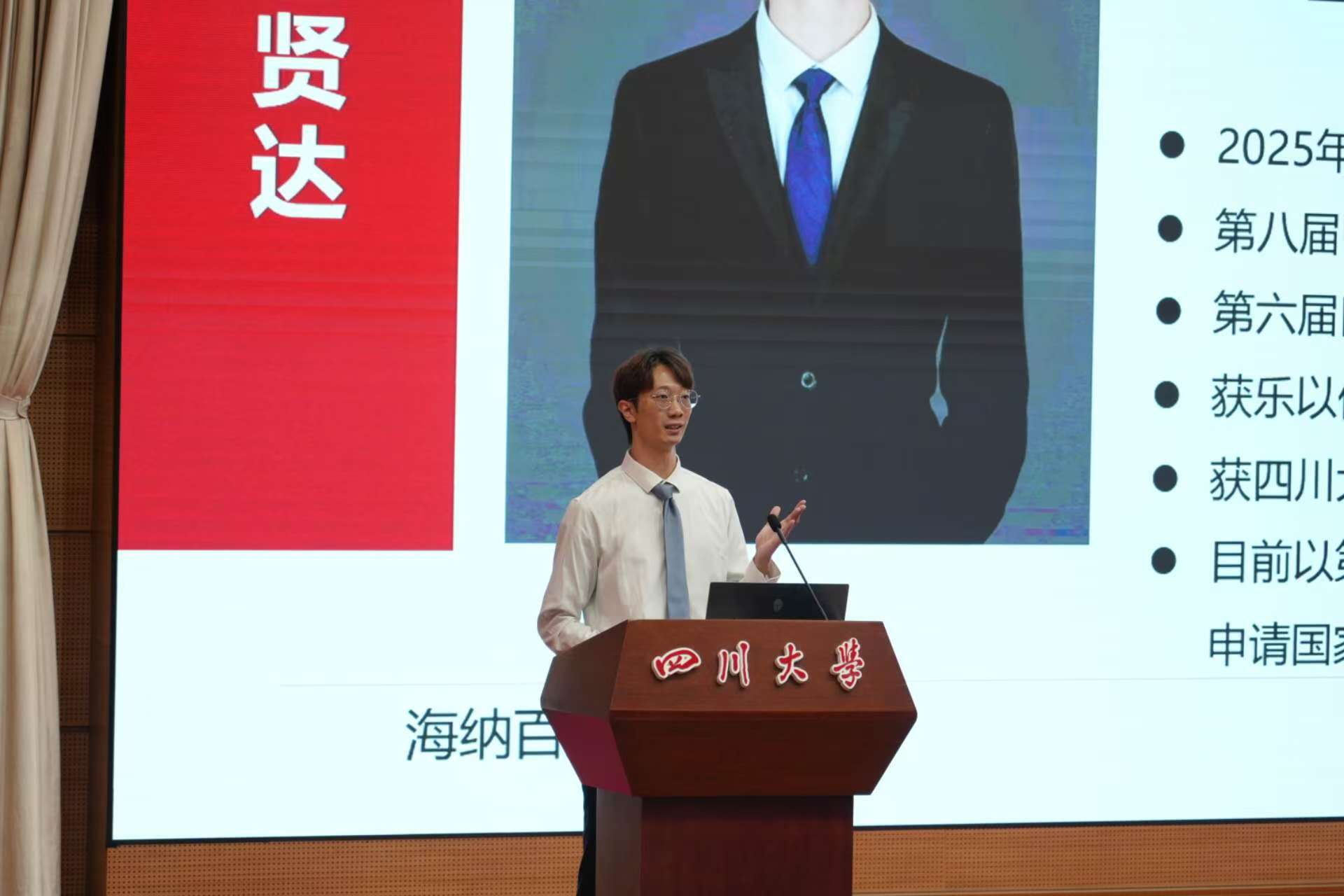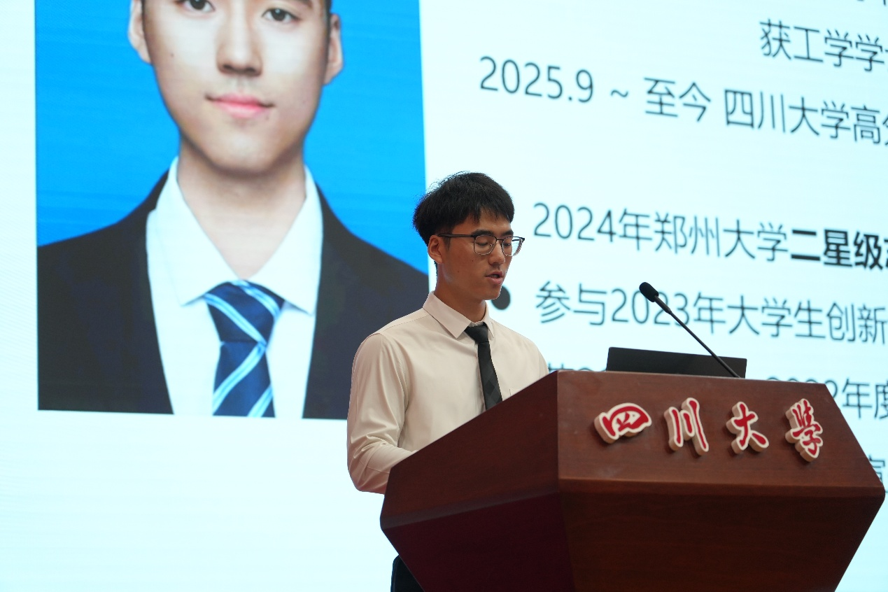2023级博士生、2025年365英国上市集团科创报国榜样说宣讲大使刘贤达作为在校生代表发言。他以自身的科研经历为例,坦言做科研曾常遭遇实验失败、论文重写等困境,但正是这些经历塑造了坚韧的心态与扎实的科研素养,他鼓励同学们要学会与科研过程中的失败体验相处,在不断争取科技创新的征程中,实现自我的人生价值。