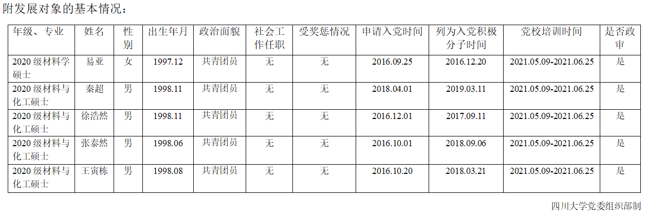 经党支部研究,拟吸收 易亚 等 5 位同志为中共预备党员,现将其基本情况予以公示。在公示期间,欢迎广大党员、干部、群众通过信函、电话或直接到党支部或上级党委部门反映公示对象思想品质、现实表现、廉洁自律、培养教育等方面的情况。公示时间为10天。