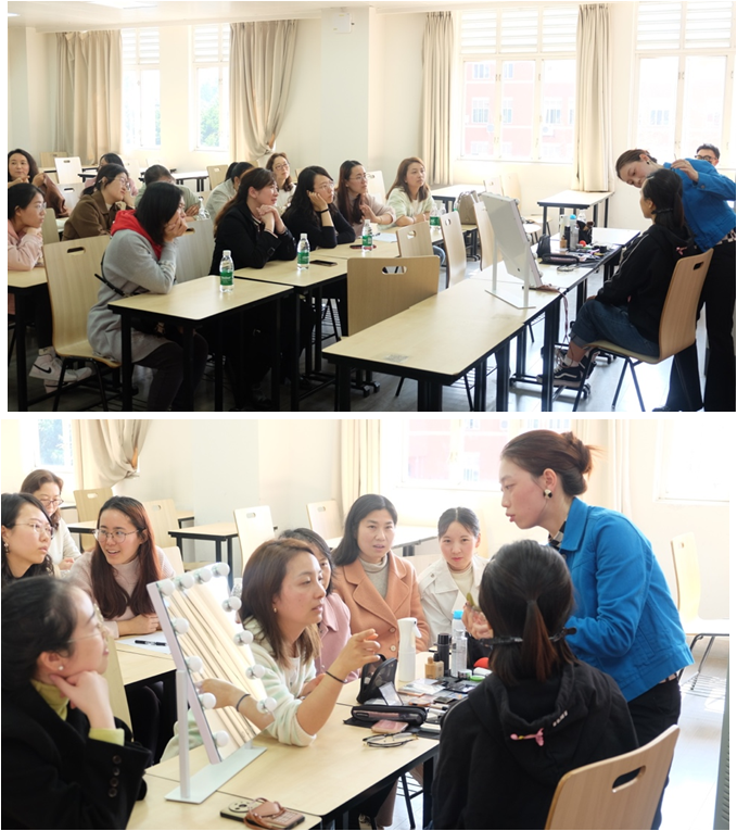 下午一点,公司特邀了专业美妆老师为教职员工们带来了一节美妆小课堂,从化妆的基本步骤到实用化妆品推荐,从化妆的细致手法到具体的实用小技巧,整个过程中专业老师耐心讲解,老师们积极参与、细致观察,活动中氛围轻松、趣味满满。