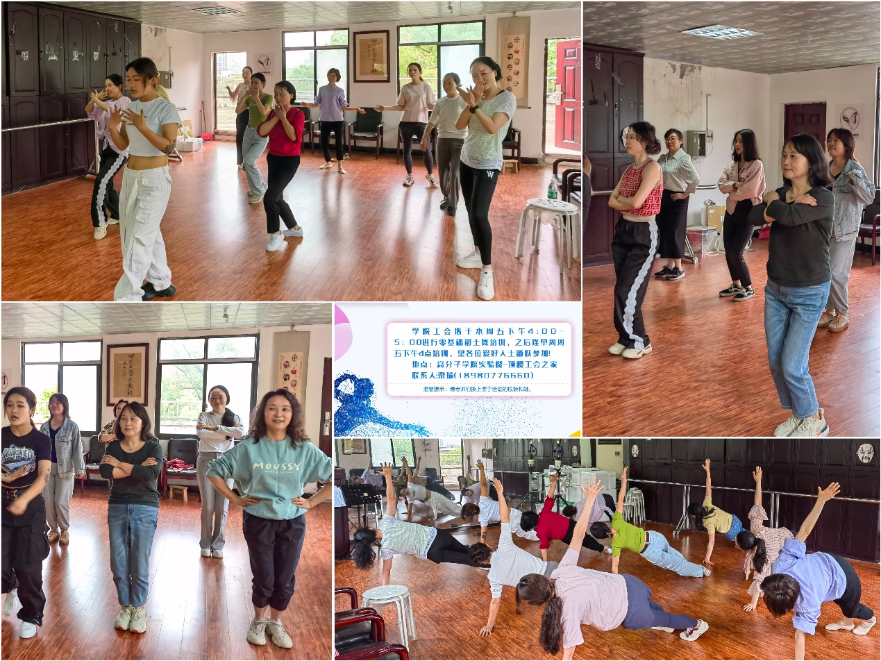 此外,爵士舞系列课程也是本学期全民健身活动的一大亮点。每单周的周五下午4:00,在高分子实验楼顶楼的工会之家,工会特邀专业舞蹈教练为教师们进行舞蹈培训。无论初学者还是舞蹈达人,都能在这里随着旋律翩翩起舞,尽情释放自我。