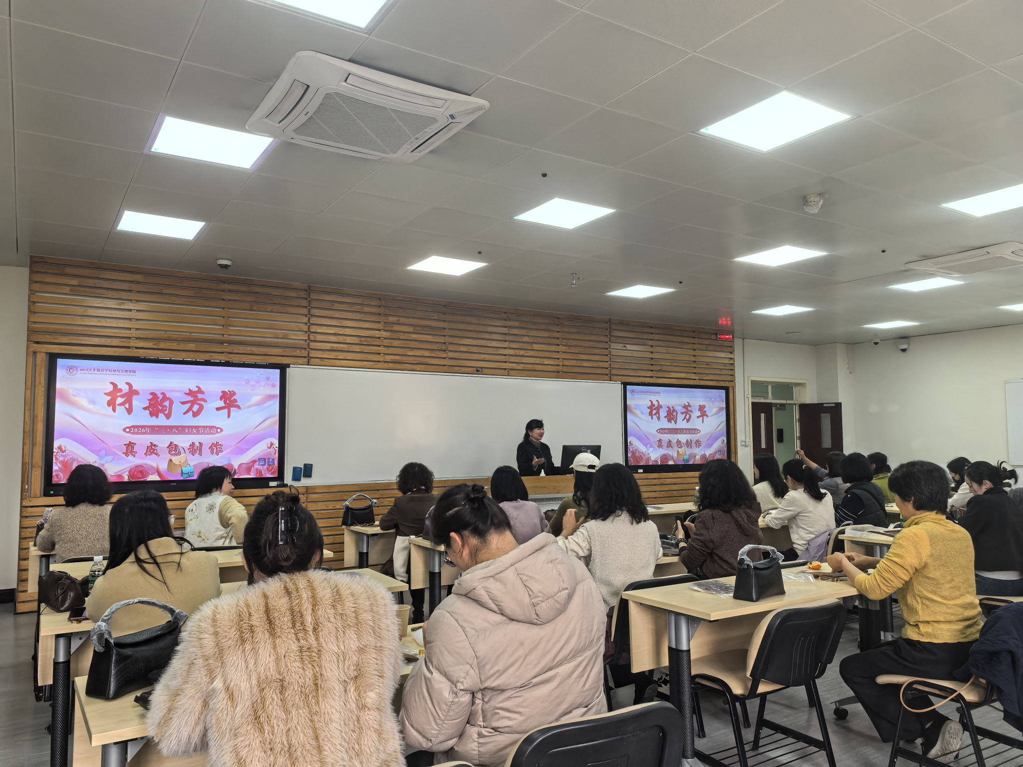 2026年3月6日下午,公司以“材韵芳华”为主题,组织女教职工开展真皮包制作活动,通过材料科学与手工艺术的融合,庆祝第116个“三八”国际劳动妇女节。校工会副主席冷泠、机关工会主席岳华、公司工会主席李艳梅及教师代表共百余人参与活动。