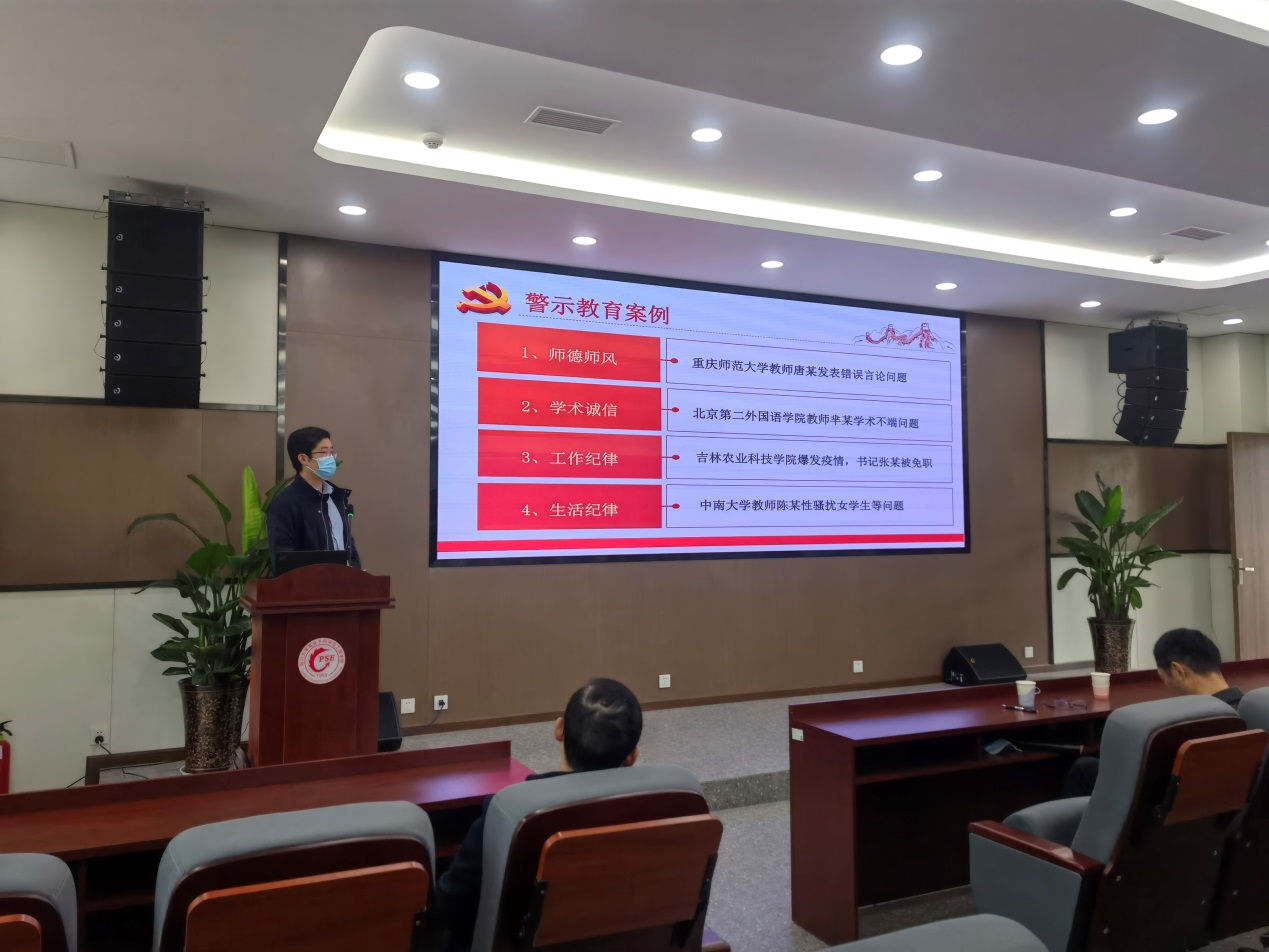 党委副书记、纪委书记钱祉祺同志组织全体教职工集中学习师德师风、学术诚信、工作纪律、生活纪律相关的警示教育案例,以案明纪释法,旨在引导党员干部和教师队伍受警醒、明底线、知敬畏,进一步推动警示教育入脑入心。