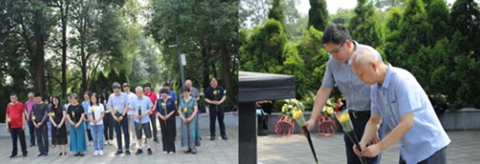 教工党支部首先到达的是位于蒲江县西来古镇铜鼓村的成都战役纪念馆,大家沿着浮雕拾级而上,来到了庄严肃静的烈士陵园区。这里安葬了217名烈士,其中成都战役中蒲江境内牺牲的烈士110名,第二次国内革命战争、解放初期剿匪、抗美援朝战争、中印中越边境自卫还击战、参加南苏丹维和任务以及执行其他任务中牺牲的107名。庄严的成都战役纪念碑前,全体党员肃穆伫立,齐声同唱中华人民共和国国歌并敬献鲜花,共同缅怀长眠于此的革命烈士。