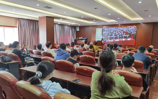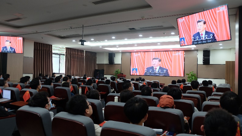 在科教楼209会议室的集中收看会场,有100余名员工党员集中观看,同学门佩戴党徽、手持国旗、认真聆听习近平总书记的大会报告,会场不时响起热烈掌声,同学们对伟大祖国的自豪感油然而生。