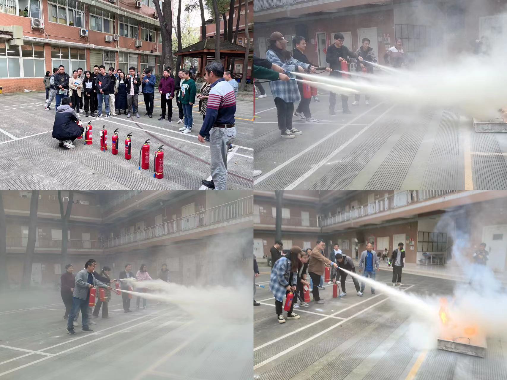 实验室安保知识培训结束后,在科教楼、实验楼、附楼、第四教学楼同时开展“烟感报警+应急逃生”演练活动。随后于实验楼院坝内进行了灭火器实操演练。杨彬老师讲解了灭火器的使用方法与注意事项,指导现场师生使用灭火器进行了灭火实操演练。