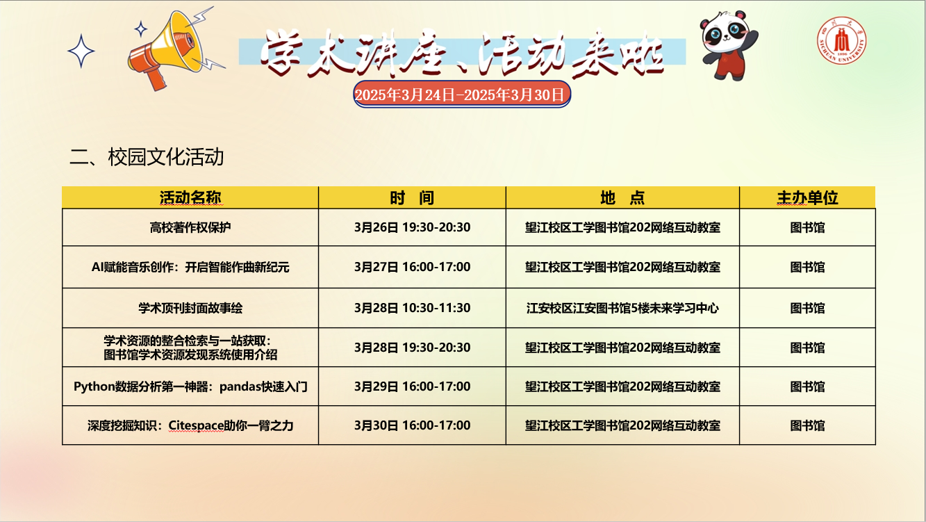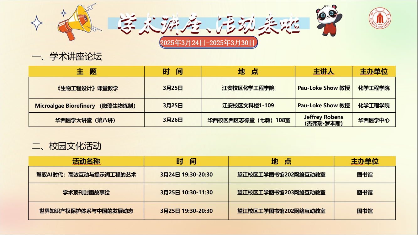 学术讲座及校园文化活动预告(3月24日-3月30日)