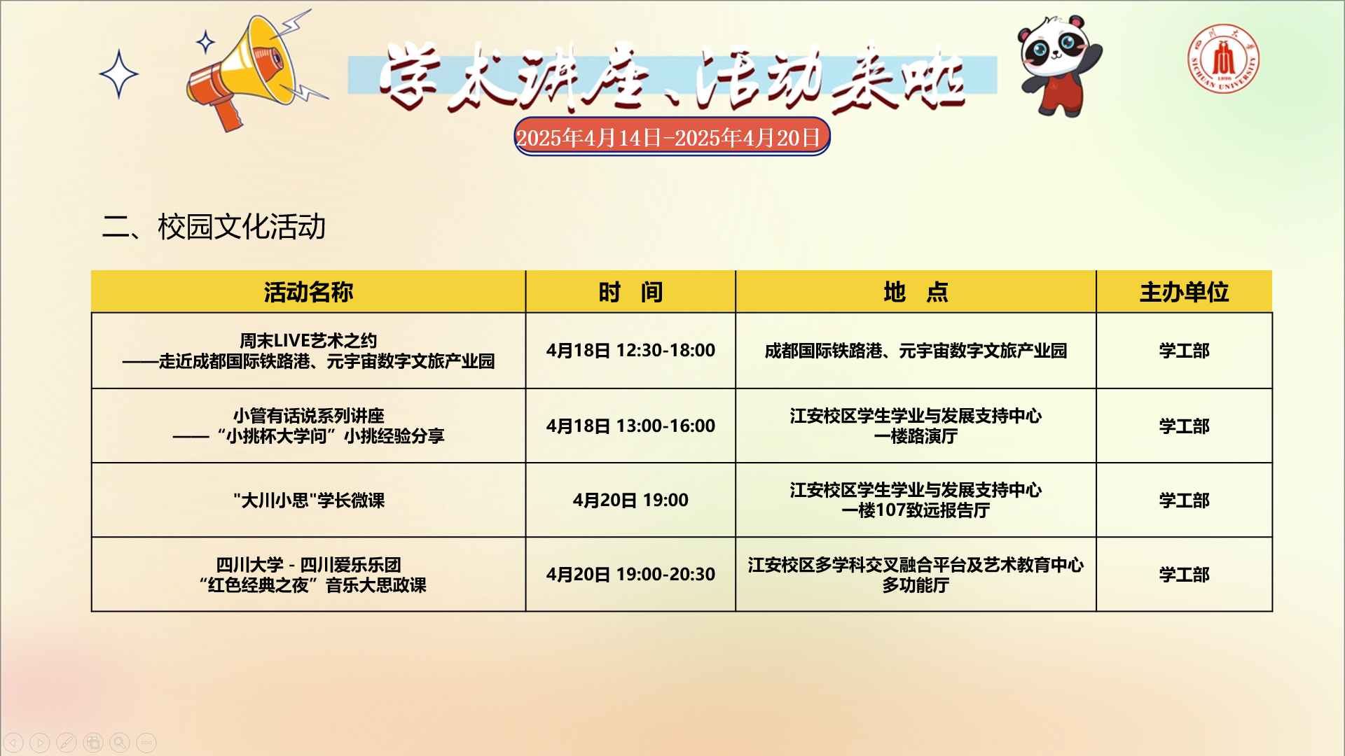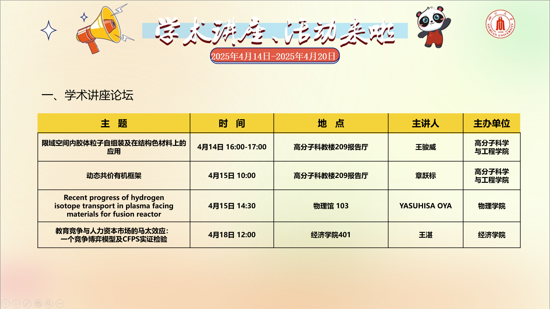 学术讲座及校园文化活动预告(4月14日-4月20日)
