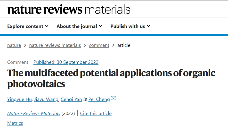 近日,公司程沛研究员团队受邀在Nature Reviews Materials(影响因子76.7)期刊上发表了题为“The multifaceted potential applications of organic photovoltaics”的前瞻性评述论文(Nat. Rev. Mater., 2022, DOI: 10.1038/s41578-022-00497-y)。该文从有机材料的分子结构与聚集态特性出发,系统论述了有机太阳能电池区别于传统无机太阳能电池的特点及优势——质量轻、半透明、厚度薄、柔性。其中,有机半导体材料具有较大的π共轭和较强的分子内电荷转移,可以实现高的消光系数与“薄”的特性;其主要元素是碳,且分子排列较为松散,从而具备“轻”的特性;有机半导体往往呈现无定形或半结晶状态,因此表现出“柔”的特性;有机半导体的吸收机制是分子轨道之间的电子跃迁,从而实现了“透”的特性。其中,“轻”和“透”的优势使其可应用于温室大棚和建筑物玻璃,以打造零能耗农业与节能建筑。而“薄”、“轻”、“柔”的特性使其可以与智能织物以及生物信息传感器完美兼容,为它们持续供能。此外,有机太阳能电池还可与其他类型的能源器件整合,实现能量的高效转换与利用。最后,该文总结了近年来在上述方面的研究进展,为有机太阳能电池在更多领域下的拓展性应用和产业化提供了新的思路。