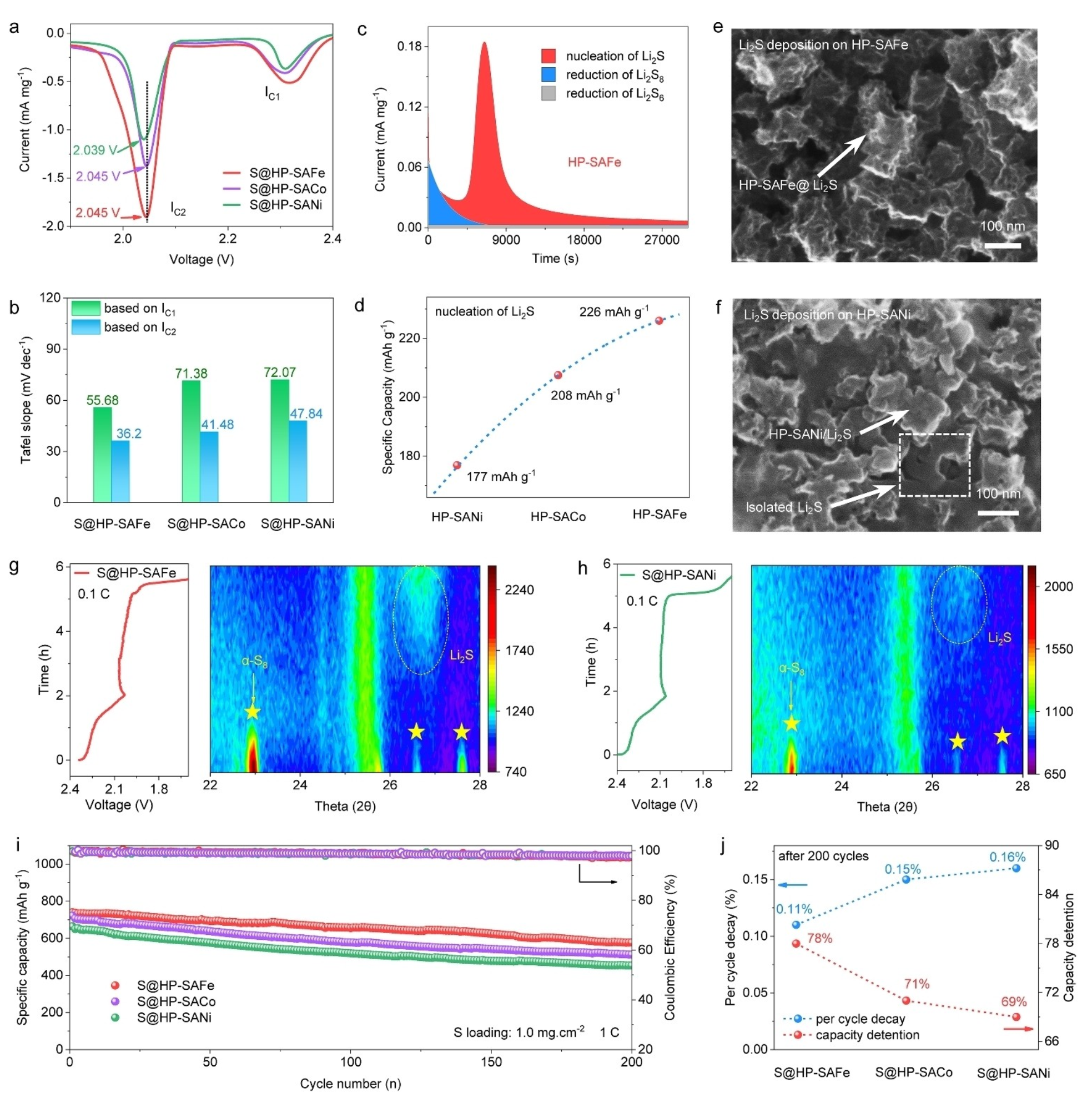 该研究工作证明了不溶性Li2S2-Li2S还原催化在FEs基单原子材料(Fe, Co, Ni)中的根本原理是与它们的自发自旋极化有关(Fe-N4> Co-N4> Ni-N4)。自旋电子最多的Fe-N4无疑促进了Li2S2-Fe-N4中Fe-S相互作用,加速了Li2S2-Li2S的还原催化。同时,HP-SAFe阴极表现出最快的Li2S沉积动力学(226 mAh g-1)和最低的热力学能垒(0.56 eV),并且S@HP-SAFe阴极在硫载量为4.1 mg cm-2的情况下表现出高平均面积容量2.8 mAh cm-2,显示出明显的应用前景。