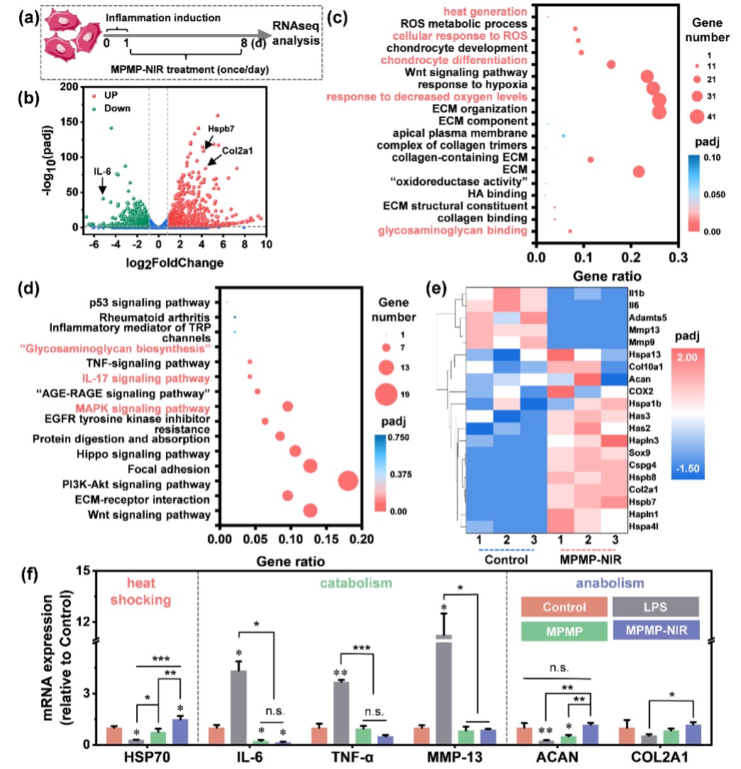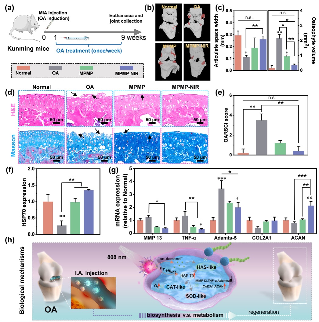 通过MIA诱导的OA小鼠模型,可以证实MPMP–NIR能够抑制关节间隙变窄、减少骨赘生成和抑制关节炎症反应,促进ColII和蛋白多糖的合成与分泌,从而恢复光滑的软骨表层。在治疗早期,MPMP–NIR发挥纳米润滑剂的功能,减缓运动过程中摩擦力造成的软骨磨损;在治疗中后期,MPMP–NIR通过其优异的类抗氧化酶活性清除关节腔内的活性物质,同时,通过激活热休克反应,一方面加速成软骨过程,一方面发挥类透明质酸酶活性促进透明质酸合成,从而补充关节润滑性能。因此,MPMP–NIR可以有效治疗OA,重塑关节稳态。