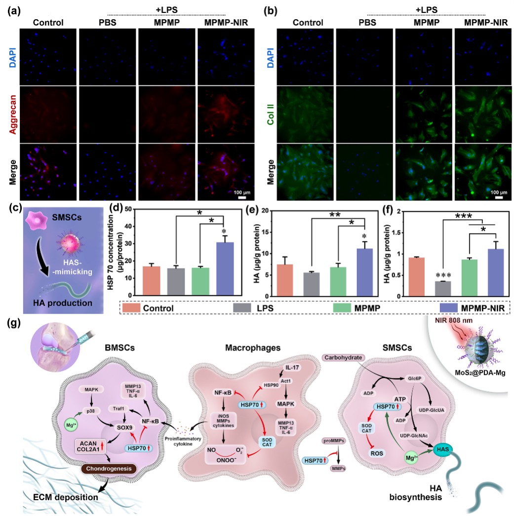 通过光热作用,MPMP–NIR可以激活细胞的热休克反应,从而通过HSP70和Mg2+抑制NF–κB、IL–17信号通路,增强MAPK信号通路。因此,MPMP–NIR在抑制细胞炎症反应、氧化应激反应的同时,既可以促进BMSCs的成软骨分化,又可以发挥类透明质酸合成酶活性促进SMSCs合成与分泌透明质酸。