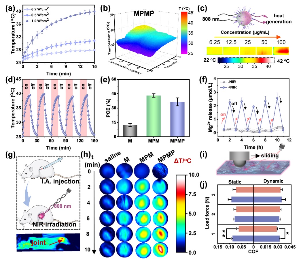 研究人员将MoS2纳米片封装于掺镁聚多巴胺的内部,然后在其表面修饰磺酸甜菜碱聚合物,从而制得MPMP纳米酶。这种纳米酶具有稳定的光热转换效率,可以实现Mg2+控释。光热作用一方面可以促进Mg2+按需释放,另一方面可以促进两性离子聚合物克服分子链之间氢键、离子–偶极作用形成的能垒,从而提更好的润滑性能(摩擦系数0.028)。