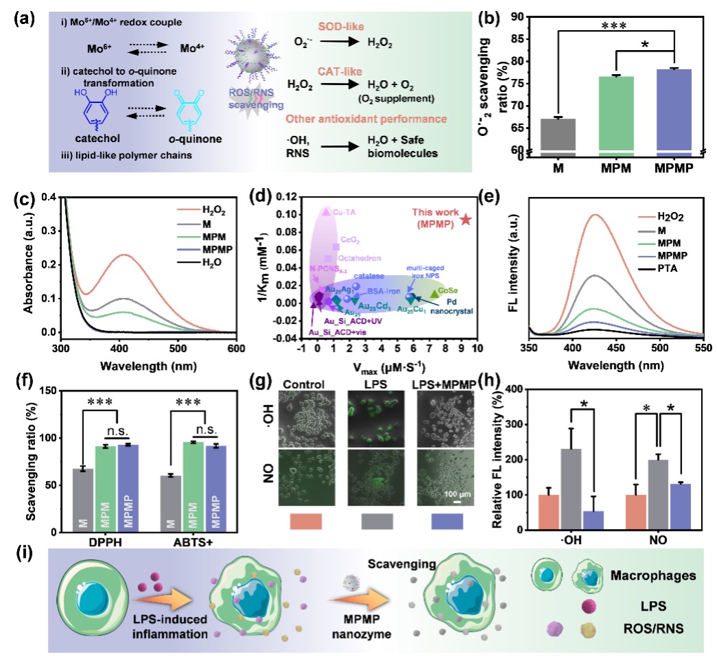 研究人员进一步分析了MPMP纳米酶的类抗氧化酶活性,发现其对于多种活性氧(H2O2、·OH、O·- 2等)和活性氮具有优异的清除效果,且能够补充O2。MPMP纳米酶对H2O2的亲和力(Km= 10.61mM)和催化速率(0.56mM/min)优于目前报道的具有类CAT活性的纳米催化材料。