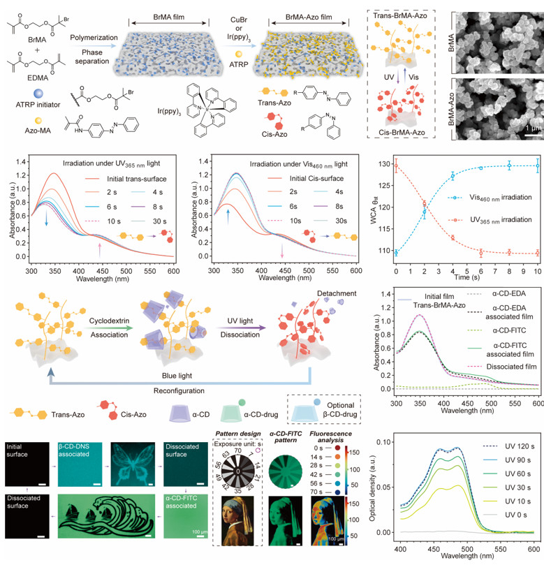 构筑的Azo-MA接枝薄膜表现出类似于偶氮苯单体的光异构化转变,并且接枝前后薄膜的多孔结构没有改变。在紫外曝光区域,薄膜上的α-CD分子在120秒内完全解离。