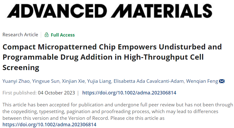 近日,冯文骞研究员团队提出利用光触发药物递送系统远程控制药物从固体表面释放,从而以无机械干扰的形式将特定的药物分子添加于细胞培养环境。利用偶氮苯衍生物表现出的顺反光异构性,加上超分子非共价相互作用的动力学性质,实现在微图案化的聚合物芯片上进行细胞高通量筛选中药物的可编程添加。该芯片不仅准确控制药物装载量、调节药物的装载种类,也克服了装载和释放过程中的交叉污染,并利用DMD光源的投影特性实现了对大量液滴单元进行独立且程序化的进程管理。相关工作“Compact Micropatterned Chip Empowers Undisturbed and Programmable Drug Addition in High-Throughput Cell Screening”为题发表在Advanced Materials期刊上,论文的第一作者为硕士研究生赵元轶,通讯作者为冯文骞研究员。