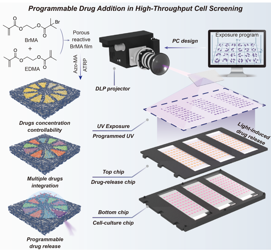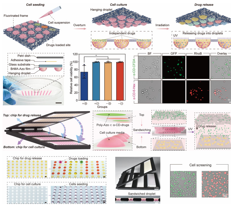图1.图案化BrMA-Azo薄膜用于高通量细胞筛选的示意图,通过光诱导实现单个微液滴内无机械干扰、程序性的药物添加