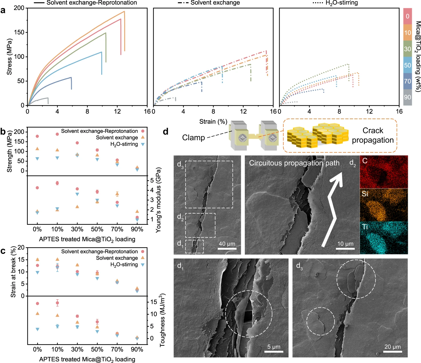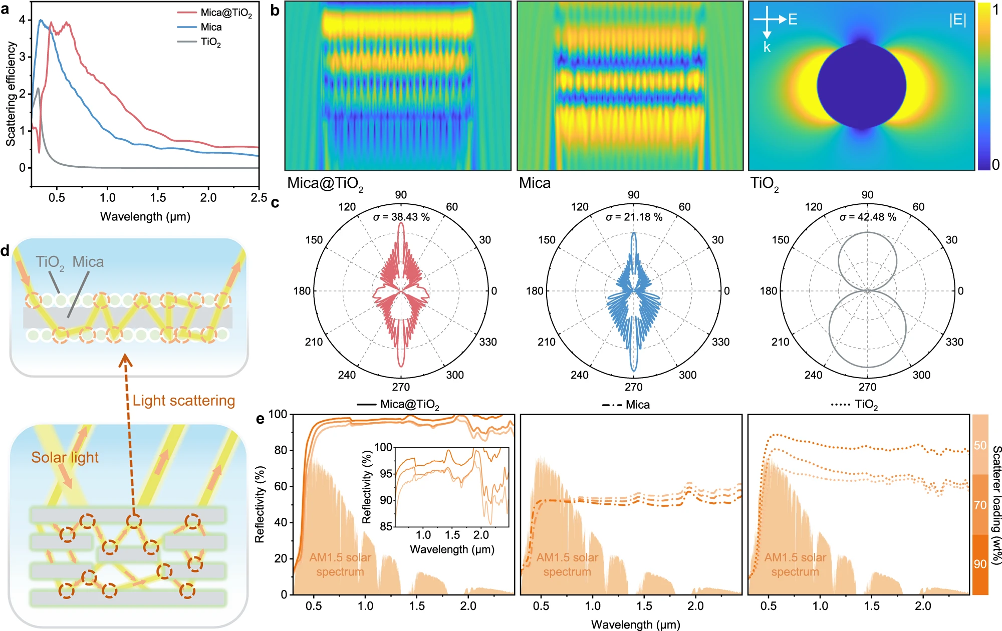 近日,公司傅强/邓华教授团队利用“溶剂交换-二次质子化”策略,构筑了一种基于芳纶纳米纤维(ANFs)树枝状胶体和云母/二氧化钛(Mica@TiO2)核壳散射体的层状PDRC薄膜(AMTA)。通过对ANFs多步质子化过程的精确调控,其呈现出高度支化的三维网络结构,可稳定负载高含量的片状Mica@TiO2核壳散射体,并快速诱导层状结构成型,赋予其超过100 MPa的力学强度。与此同时,核壳散射体在光学模拟中也呈现出更强的散射效率因子,尤其是背向散射,它连同其它折射率差异界面处的散射行为(如孔隙界面)共同促进了PDRC材料的太阳光反射率(>90%),并在实际户外制冷测试中实现日间降温3-4℃,夜晚降温6-7℃。此外,依赖于各组分本征的优异性质,该设计还集成了绝缘、紫外耐候、耐高温、耐刮擦等综合实用性能,有望进一步应用于车衣、手机、电缆热管理防护等领域,为PDRC技术在户外场景中的持久服役提供了潜在可能。该工作以“Thin lamellar films with enhanced mechanical properties for durable radiative cooling”为题发表在Nature Communications上(Nat. Commun. 2023, 14, 6129)。文章第一作者是365英国上市集团硕士研究生熊联虎。该研究得到国家科学技术部(重点研发计划)的资金支持。