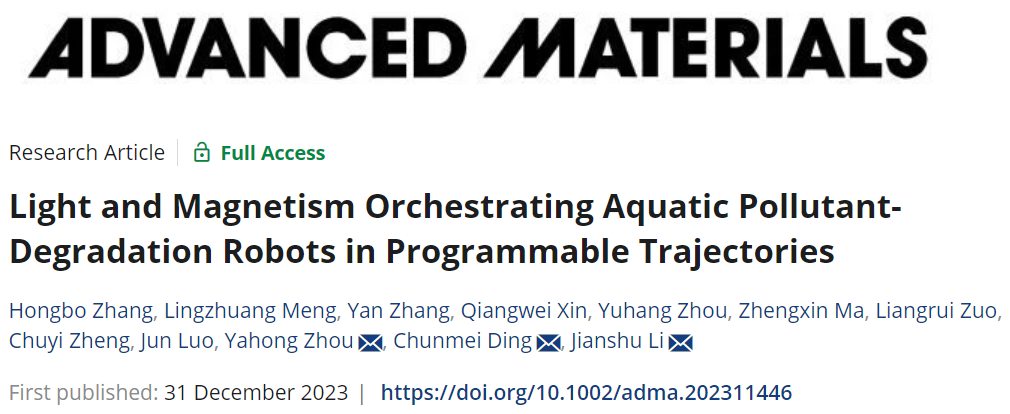 该工作以“Light and magnetism orchestrating aquatic pollutant-degradation robots in programmable trajectories”为题发表在《Advanced Materials》上,第一作者为公司2023级博士研究生张鸿博。共同通讯作者为公司丁春梅副教授/李建树教授和中科院理化所周亚红副研究员。该研究成果已授权中国发明专利(专利号:ZL202210900642.1)。该项工作得到国家自然科学基金(基金号:52373295,51925304,21988102,52273135),中国科公司青年创新促进会(Grant NO. 2021029)和高分子材料工程国家重点实验室(Grant No.:sklpme 2023-2-02)的支持。