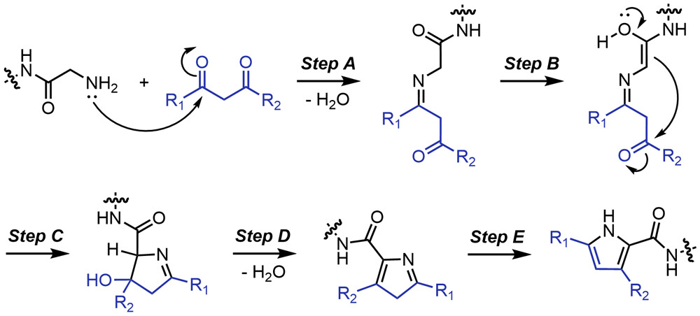 图2.多肽N末端甘氨酸与1,3-二酮的反应机理