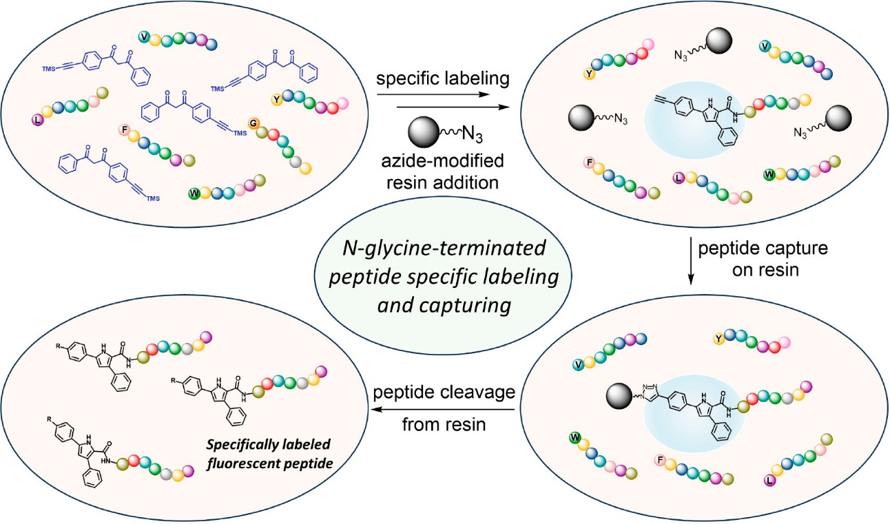 为验证方法的实用性,作者利用含炔基的1,3-二苯基-1,3-丙二酮与N末端为甘氨酸(G)、苯丙氨酸(F)、缬氨酸(V)、色氨酸(W)、亮氨酸(L)和酪氨酸(Y)的混合多肽体系进行反应。之后,通过在酸性条件下使亚胺水解等一些简单处理后,作者利用叠氮基团修饰的树脂珠粒与产物的炔基发生CuAAC反应,进行了“pull-down”实验,最终将N末端为甘氨酸的多肽特异性地修饰和提取出来。该方法为复杂体系中N末端为甘氨酸的多肽的特异性修饰、捕获和荧光检测提供了一种有效的方法。该工作于近期发表在J. Am. Chem. Soc.上。
