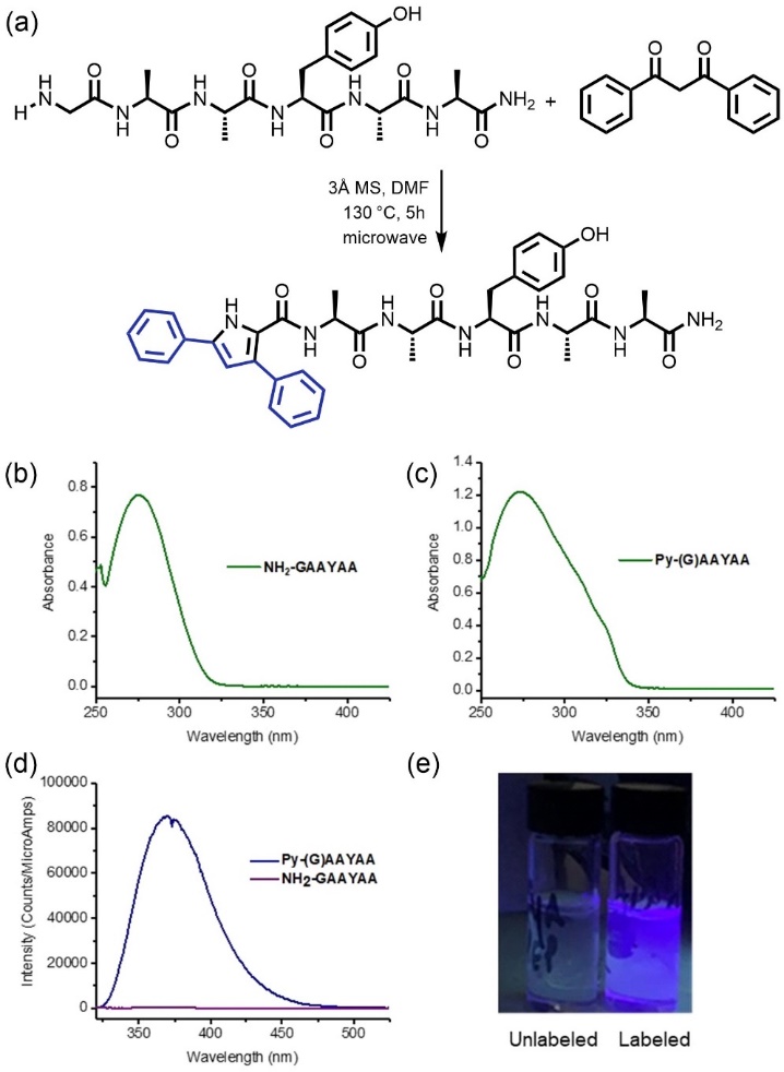 本工作首先利用甘氨酸甲酰胺盐酸盐作为研究对象与1,3-二苯基-1,3-丙二酮进行反应,测试了方法的有效性,并通过核磁、质谱和X-射线单晶衍射等表征方法确定了产物为二苯基取代的吡咯衍生物。然后通过紫外可见吸收光谱和荧光光谱等测试,确定了产物可以在367 nm处给出强的荧光。在确定了该方法的可行性后,作者进一步将其用于N末端为甘氨酸的多肽的荧光修饰(图2)。实验结果表明,当肽链中含有赖氨酸、丝氨酸、谷氨酰胺、谷氨酸、天冬氨酸、甲硫氨酸和酪氨酸等具有特殊侧基的氨基酸时,仍体现出良好的修饰效果。当结构中含有半胱氨酸时,可将其巯基用碘乙酰胺保护后参与反应并最终获得目标产物;而当肽链中含有赖氨酸时,其侧链的氨基虽然可以与1,3-二酮反应生成亚胺,但该副产物可以在酸性条件下水解成目标产物。