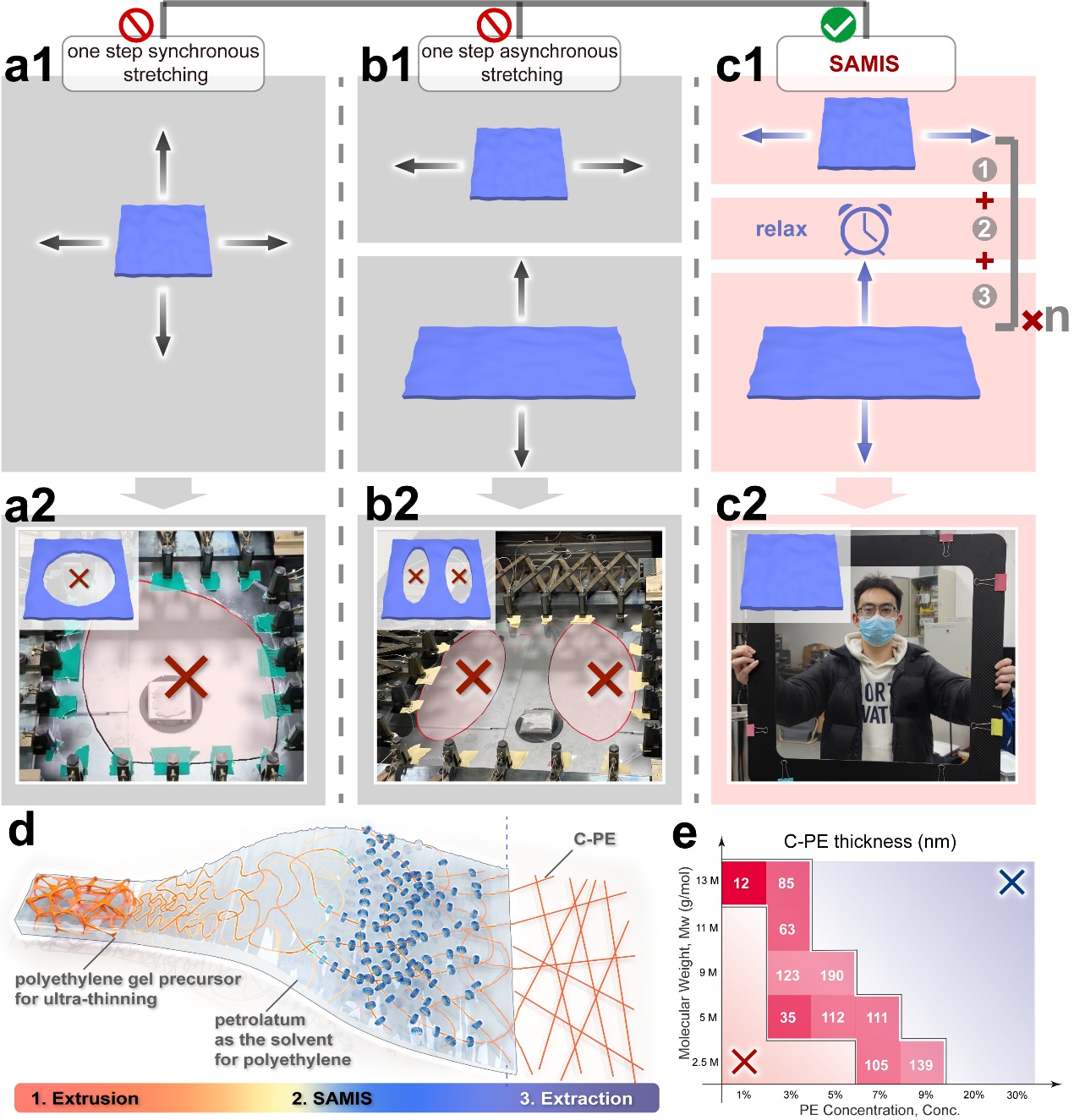 动力学过程控制:小幅多步间歇拉伸技术:识别其加工窗口仅是第一步,团队需要一种新的、可行的加工方法。实际加工中,将聚乙烯打薄至它的临界厚度十分困难,因为在超薄厚度下稳定性与加工性之间的矛盾加剧。特别是对于经历大应变后,克服高表面张力和内部应力时将面临相当的困难。团队借鉴食品工业中用于减轻面筋蛋白内部应力的多步拉伸和放松技术,构想了一种多步增量拉伸的准稳态方法,以克服巨大的能量障碍,每个拉伸步骤后均设有周期性的暂停以缓解应力。团队将这种技术命名为SAMIS(小幅度多间隔拉伸)(图4d1)