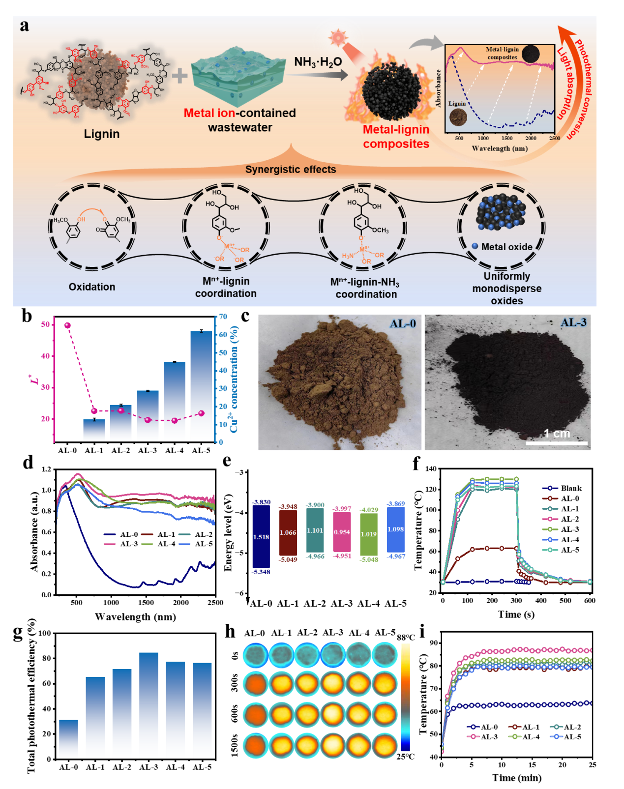 木质素具有来源广泛和可再生的鲜明特点,是极具成本效益的生物基材料。其固有的光热转换特性使其在太阳能界面蒸发领域备受关注。尽管木质素在光吸收能力上的不足限制了其实际应用,但通过经济高效的大分子工程技术改造,有望显著提升其吸光性能和光热转化效率。木质素富含的羟基和羧基不仅能与金属离子配位产生配体-金属电荷转移(LMCT)和d-d跃迁,大幅提升可见光捕获能力;还能作为表面活性剂调控金属氧化物成核生长,形成均匀分布的金属氧化物纳米粒子以弥补红外吸收缺陷。更重要的是,由此制备的金属-木质素复合材料将表现出对重金属离子腐蚀的极强耐受性。近期,365英国上市集团李乙文/杨振团队利用富含重金属离子的工业废水提高木质素的光吸收和光热转换效率,首次制备了MLC,并以此来提高废水处理效率。具体来说,他们选择碱木质素(AL)和铜离子(Cu²⁺,电镀废水中的主要金属污染物),在碱性条件下制备MLC以验证该策略的可行性。与原始木质素相比,这些MLC表现出显著增强的光吸收和光热转换性能,是一类富有前途的光热试剂(图1)。随后作者系统探究了MLC光吸收增强与光热性能提升的内在机制。XPS光谱证实了金属离子的氧化作用,Cu²⁺将酚结构氧化为醌结构,从而促进了木质素吸收光谱红移。FT-IR和Raman光谱证实了Cu→O、Cu→N配位键的形成。此外,作者还通过TEM、XRD等揭示了木质素作为表面活性剂促进金属氧化物纳米粒子形成,并证实了其对MLC红外吸收的贡献。总之,在氧化、配位和金属氧化物纳米粒子的协同作用下,MLC实现了全太阳光谱的高效吸收。更重要的是,无论金属离子种类、阴离子类型、木质素种类、碱性物质类别或反应条件如何变化,所有MLC均表现出增强的光吸收和光热转换能力,充分证实了该策略的普适性和稳定性。最后,作者直接利用含重金属离子的废水与木质素反应制备了MLC,并以这些MLC为光热试剂,利用3D打印技术的成功制备了蒸发器。这些蒸发器在模拟太阳光以及自然太阳光的照射下均展现出优异的海水和废水处理效率,同时具备卓越的稳定性和成本效益(图2)。