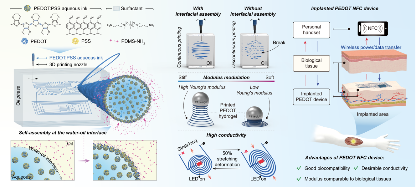 PEDOT:PSS基三维导电水凝胶凭借更符合真实使用环境的可设计三维结构、原料商业可获得、易加工、导电率高等特点,逐步应用到电子皮肤、脑机接口、可植入式三维生物电子器件等领域。在众多制备该水凝胶的方法中,3D打印技术依赖其特有的高设计性与便捷加工性等优点,已经成为制备PEDOT:PSS基三维导电水凝胶的重要手段之一。然而,无论是使用成熟的挤出直写式3D打印技术进行层层堆叠制备水凝胶,或利用光固化3D打印技术进行光致聚...