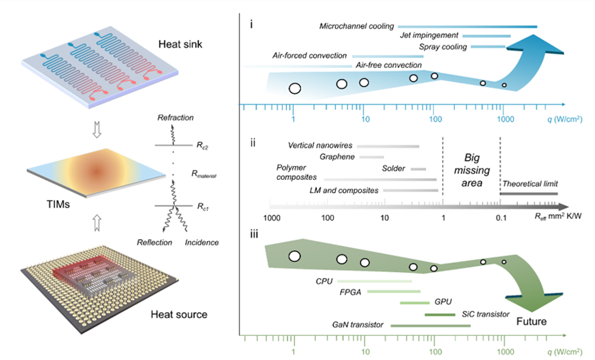 在现代电子系统中,热管理已经成为一个日益紧迫的挑战,尤其是在数据中心、雷达、高能激光以及高性能计算等领域。随着功率密度的增加,散热需求迅速攀升,仅数据中心一项,每年就消耗约200太瓦时(TWh)的电能用于冷却设备,防止其过热。目前,强制空气对流和微通道冷却等技术虽在理论上能够应对当代电子设备的高热流需求,但在实际应用中,热源与冷却介质(热沉)之间的热阻依然是一个巨大的障碍,限制了这些冷却系统的有效性。为...