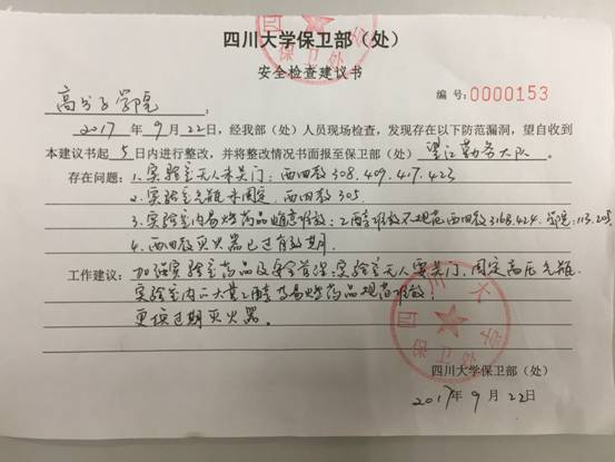 2017年9月22日下午,公司副书记钱祉祺、副经理李艳梅、组织实验室安全秘书、党政办人员对公司教学、科研用房进行了安全消防检查。